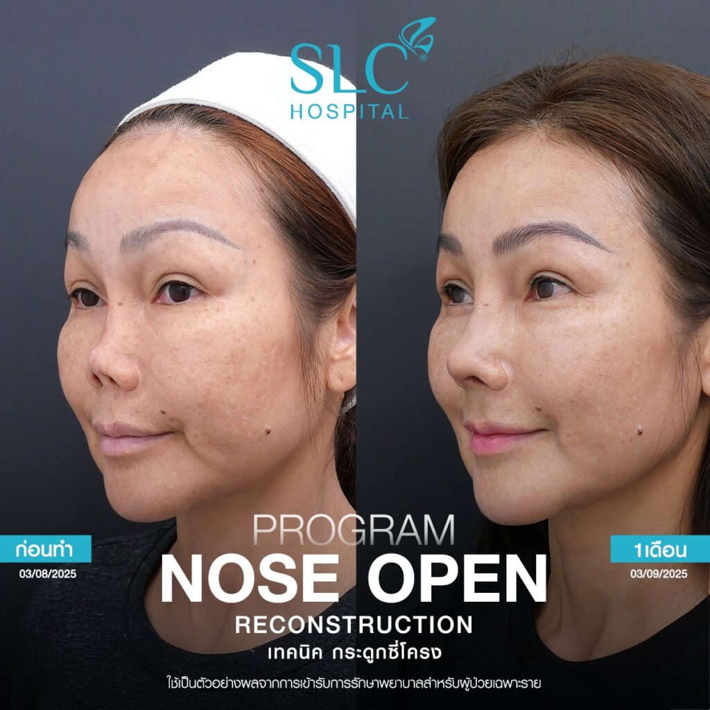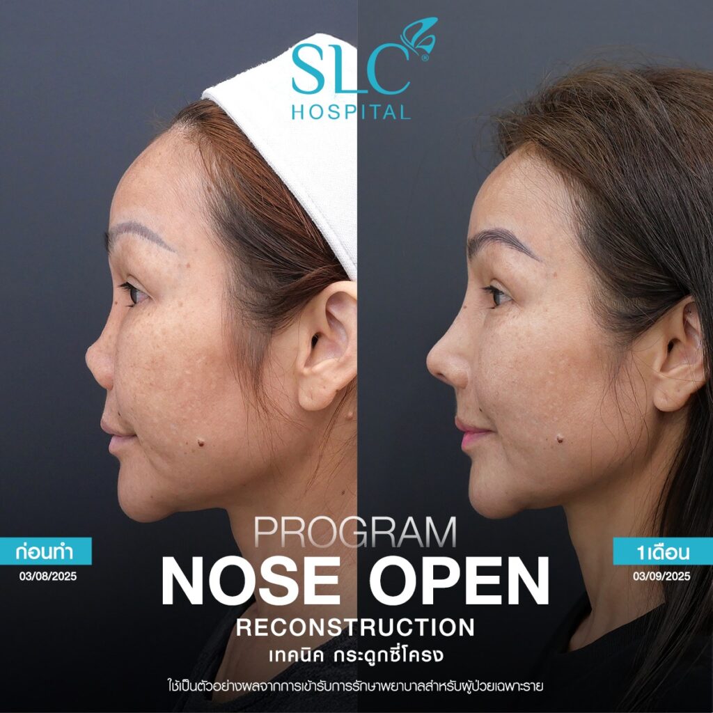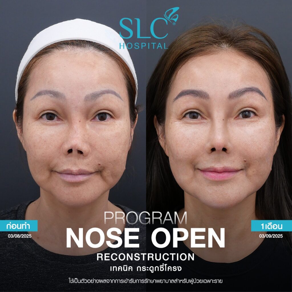สำหรับ Nose Open Reconstruction เป็นการเปิดจมูกอย่างละเอียดเพื่อตรวจประเมินความเสียหายที่เกิดขึ้นจริงในระดับโครงสร้าง ซึ่งต่างจากการเสริมทั่วไปที่เน้นเพิ่มรูปทรงเป็นหลัก โดยขั้นตอนสำคัญประกอบด้วยการเลาะพังผืด การปรับเนื้อเยื่อที่เสียสมดุล การเสริมกระดูกอ่อนบางส่วนเพื่อเพิ่มแรงพยุง และการจัดเรียง สัน ปลาย ให้เข้ากับสัดส่วนใบหน้าอย่างเหมาะสม การซ่อมโครงสร้างลักษณะนี้ช่วยรองรับจมูกในระยะยาว และทำให้จมูกกลับมาตั้งรูปได้ดีขึ้น ซึ่งผลที่ได้เกิดจากการวางแผนตามปัญหาเฉพาะราย โดยผลลัพธ์อาจแตกต่างไปตามโครงสร้างเนื้อเยื่อของแต่ละบุคคล
