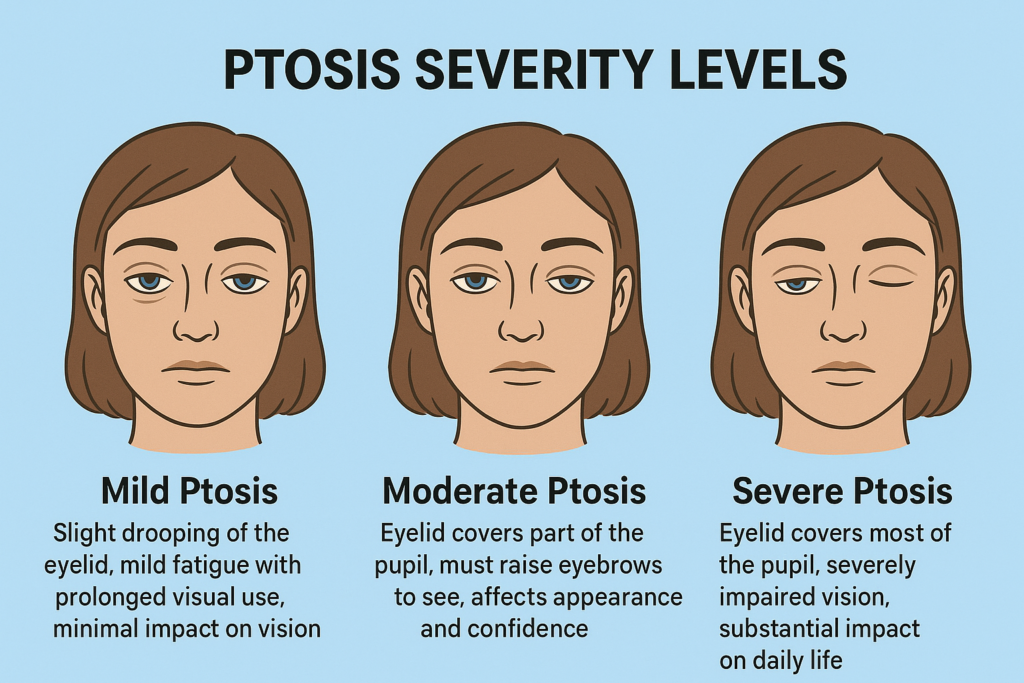 - ระดับเล็กน้อย (Mild Ptosis) เปลือกตาตกลงเพียงเล็กน้อย มีอาการเหนื่อยล้าเล็กน้อยเมื่อใช้สายตานาน ไม่มีผลกระทบมากต่อการมองเห็น