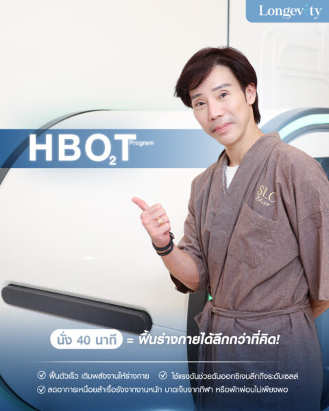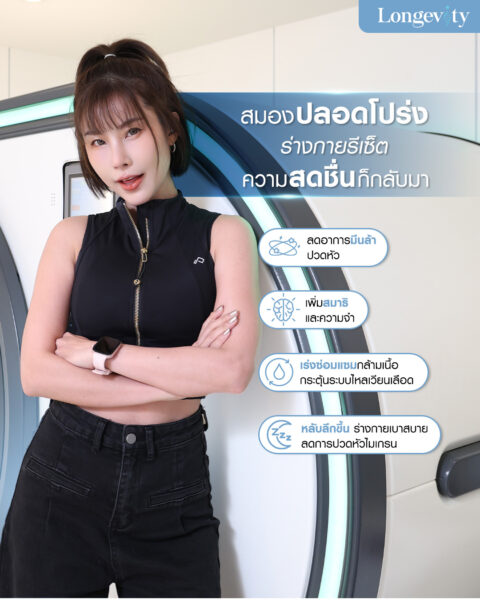 - บูสต์พลังงาน สำหรับคนที่อ่อนเพลีย พักผ่อนน้อย หรือเครียดสะสม การทำโปรแกรมออกซิเจนบำบัด Hyperbaric Oxygen Therapy (HBOT) จะช่วยให้ร่างกายรีเฟชรสดชื่น หายเหนื่อย และนอนหลับได้ลึกขึ้น ตื่นมาผิวพรรณสดใส เปล่งปลั่งเหมือนได้นอนเต็มอิ่ม