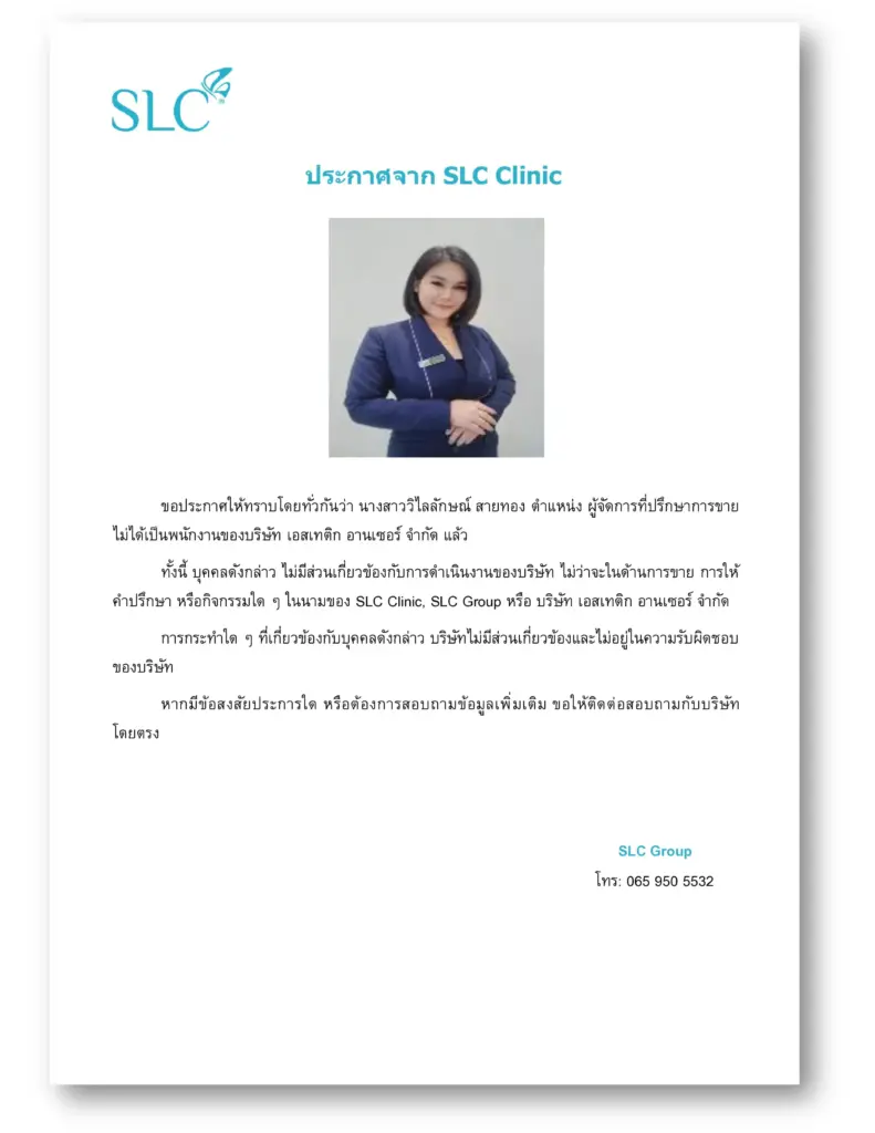 ทั้งนี้ บุคคลดังกล่าว ไม่มีส่วนเกี่ยวข้องกับการดำเนินงานของบริษัท ไม่ว่าจะในด้านการขาย การให้คำปรึกษา หรือกิจกรรมใด ๆ ในนามของ SLC Clinic, SLC Group หรือ บริษัท เอสเทติก อานเซอร์ จำกัด