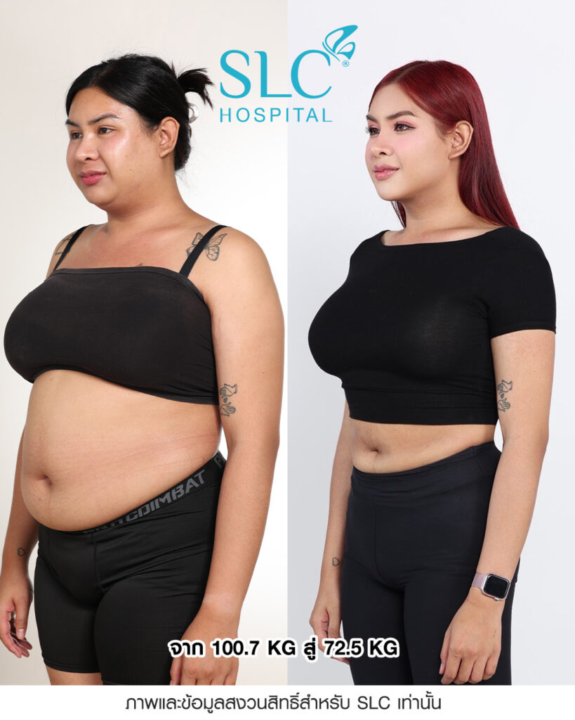 สาวสวยชุดแดงกับสมยานาม สาวน้อยร้อยโล และเป็นเคสตัดกระเพาะเคสแรกของโรงพยาบาลศัลยกรรม SLC ต้องเล่าย้อนกลับไปก่อนเลยว่าก่อนหน้านี้ ตัวเธอเองเป็นคนที่จอยกับการกินเป็นชีวิตจิตใจ เอาเป็นว่าเวลากินข้าวถ้าแยกไปนั่งกินคนเดียวได้ก็จะแฮปปี้มาก เพราะไม่ชอบให้ใครมาแย่ง และด้วยการที่รักในการกินมาก แน่นอนว่าเราเห็นตัวเองทุกวัน ก็ไม่ได้รู้สึกว่าตัวเอง อ้วนขึ้นมากหรอก เพราะก็ยังมองว่าตัวเองอยู่ในจุดที่โอเคอยู่ แต่ก้นะ ไหน ๆ ก็ไหน ๆ แล้วก็อยากจะลองชั่งน้ำหนักดูซักหน่อย จะได้รู้ว่าที่มันขึ้นมามันขึ้นมากี่โล แต่เจ้าตัวก็ถึงกับอึ้งกับตัวเลข เพราะน้ำหนักขึ้นมาถึงร้อยโลครั้งแรกในชีวิต ละทำไงหละทีนี้ จะให้หยุดกินก็ยาก จะให้ออกกำลังกายก็เหนื่อย จนในที่สุดก็ขอพึ่งทางลัดที่ปลอดภัยอย่าง ศัลยกรรม ตัดกระเพาะหมอพีท และเชื่อป่ะว่าจากคนที่จอยกับการกินมาก ๆ จนทุกวันนี้ผ่านไปครึ่งปีแล้ว ไม่อยากจะเชื่อ ว่าเธอทำมันได้ เพราะปัจจุบันนี้น้ำหนักตัวลดลงมาอยู่ที่ 72.5 กิโลเท่านั้น คือหายไปเกือบ 30 โล โคตรจะจึ้งโคตรจะว้าว และถ้าอยากเห็นการเปลี่ยนแปลงกันชัด ๆ ก็มาดูกันได้เลย และถ้ายังไม่จุใจสามารถ ดูรีวิวเพิ่มเติมได้ตรงนี้เลย